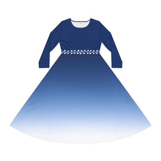 Gemstone Collection Dance Dress: Sapphire Ombre Women's Long Sleeve Elegant Modest Fall Winter Dress Vine Illusion Waistband Design Formal Evening or Casual