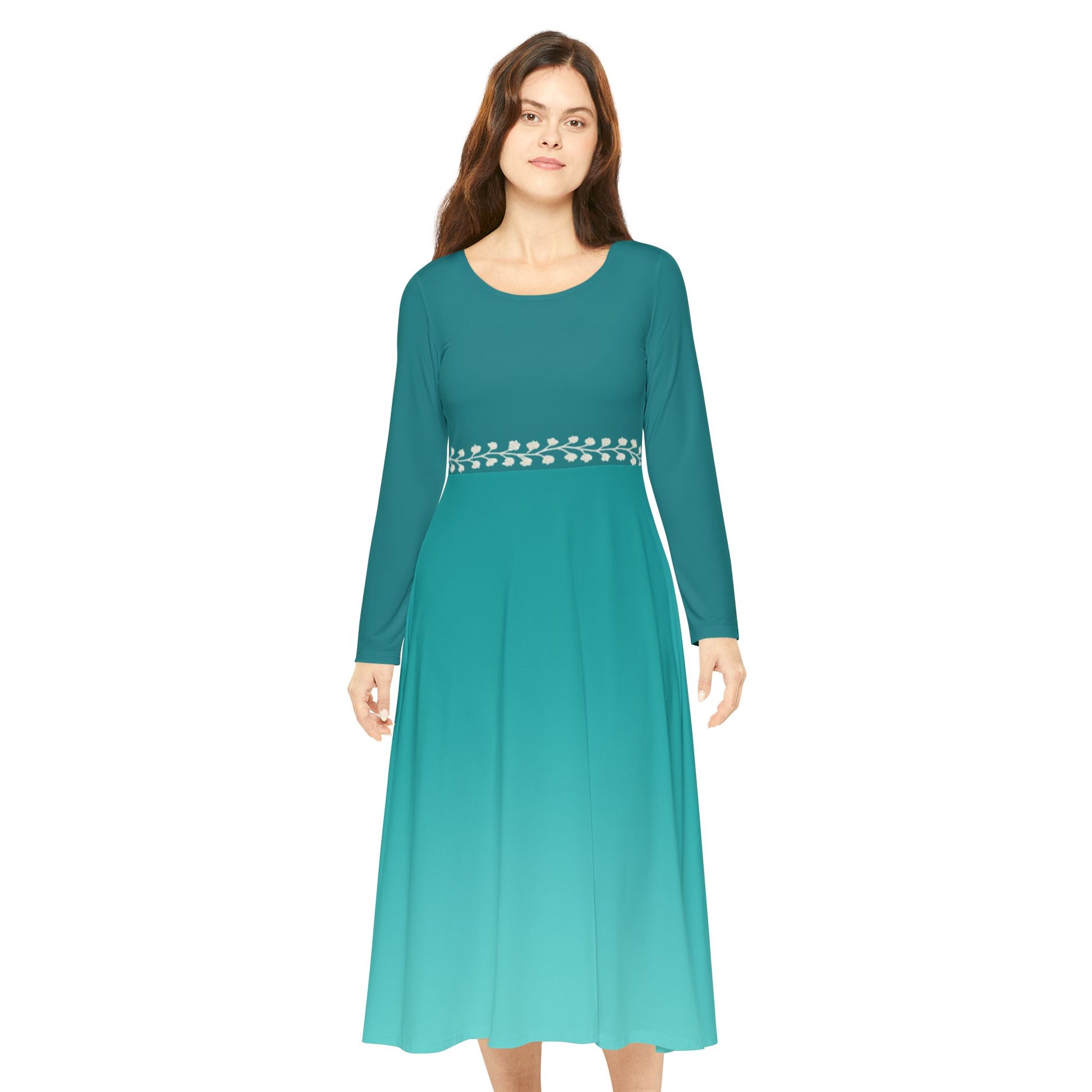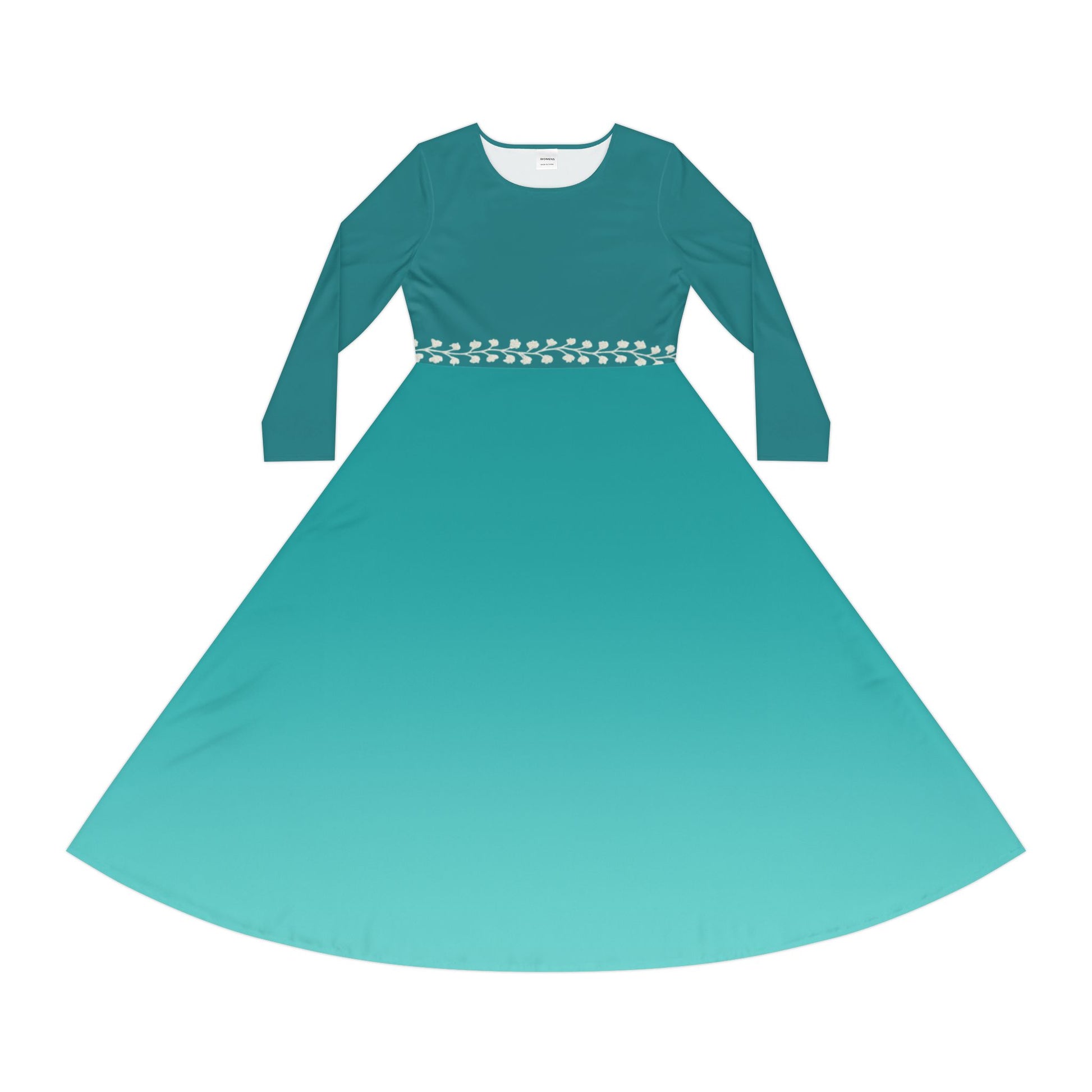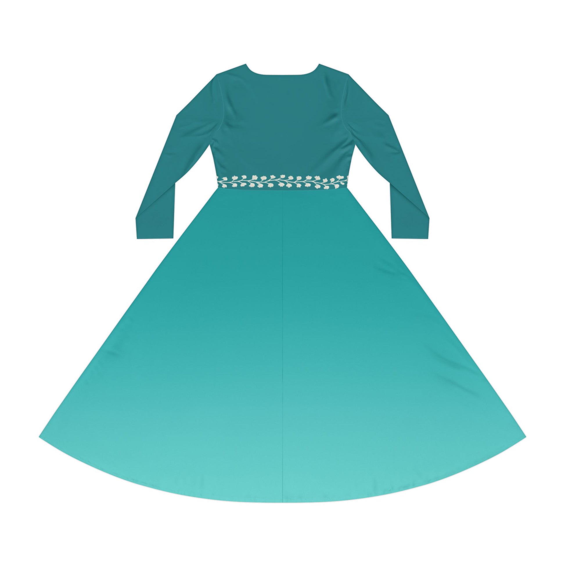 Aquamarine ombre dance dress, suitable for Fall and Winter wear. Can be worn formally or casually, featuring a white vine illusion waistband. Part of the new Gemstone collection, this dress exudes elegance and charm, perfect for special events or a casual outing with the family to a Winter festival.