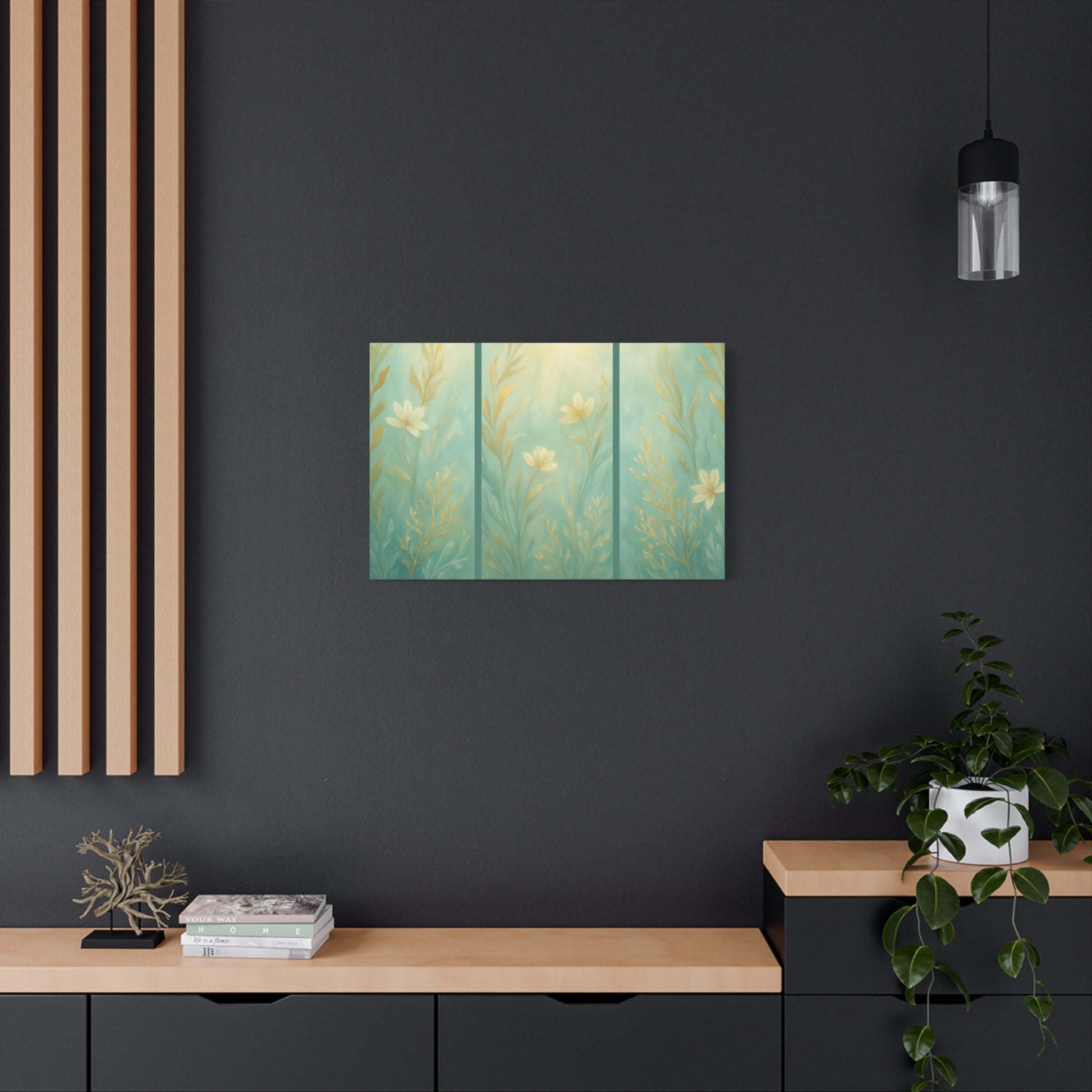 Immerse your home in the peaceful beauty of the coast with this ethereal canvas print. Soft seafoam greens blend with delicate golden botanicals, evoking underwater gardens bathed in sunlight. Though a single canvas, the design creates the illusion of a graceful triptych—bringing elevated style without the complexity of multiple pieces.