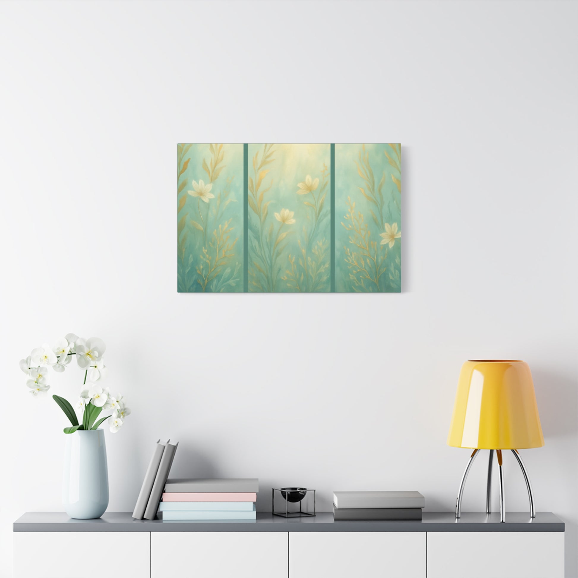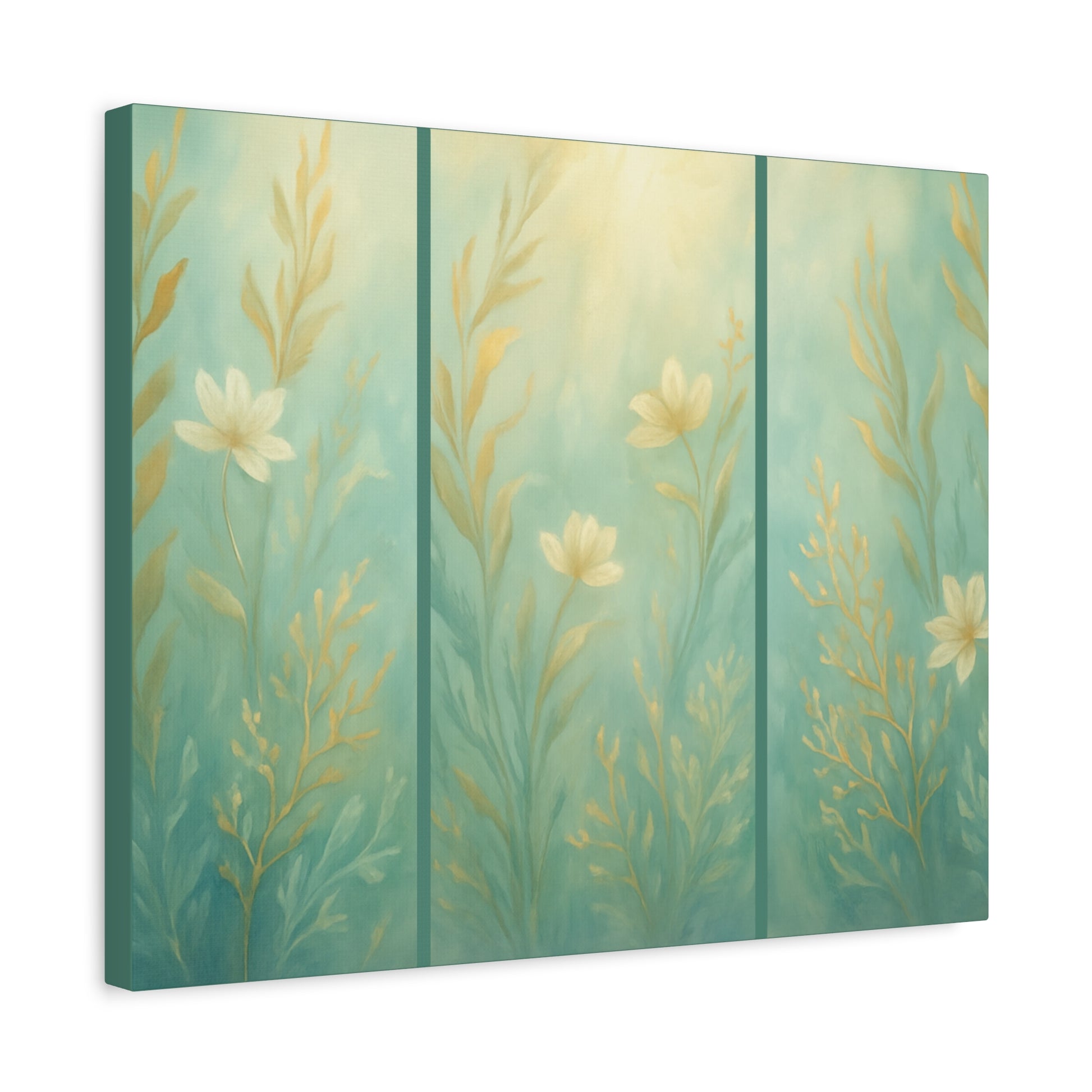 Immerse your home in the peaceful beauty of the coast with this ethereal canvas print. Soft seafoam greens blend with delicate golden botanicals, evoking underwater gardens bathed in sunlight. Though a single canvas, the design creates the illusion of a graceful triptych—bringing elevated style without the complexity of multiple pieces.