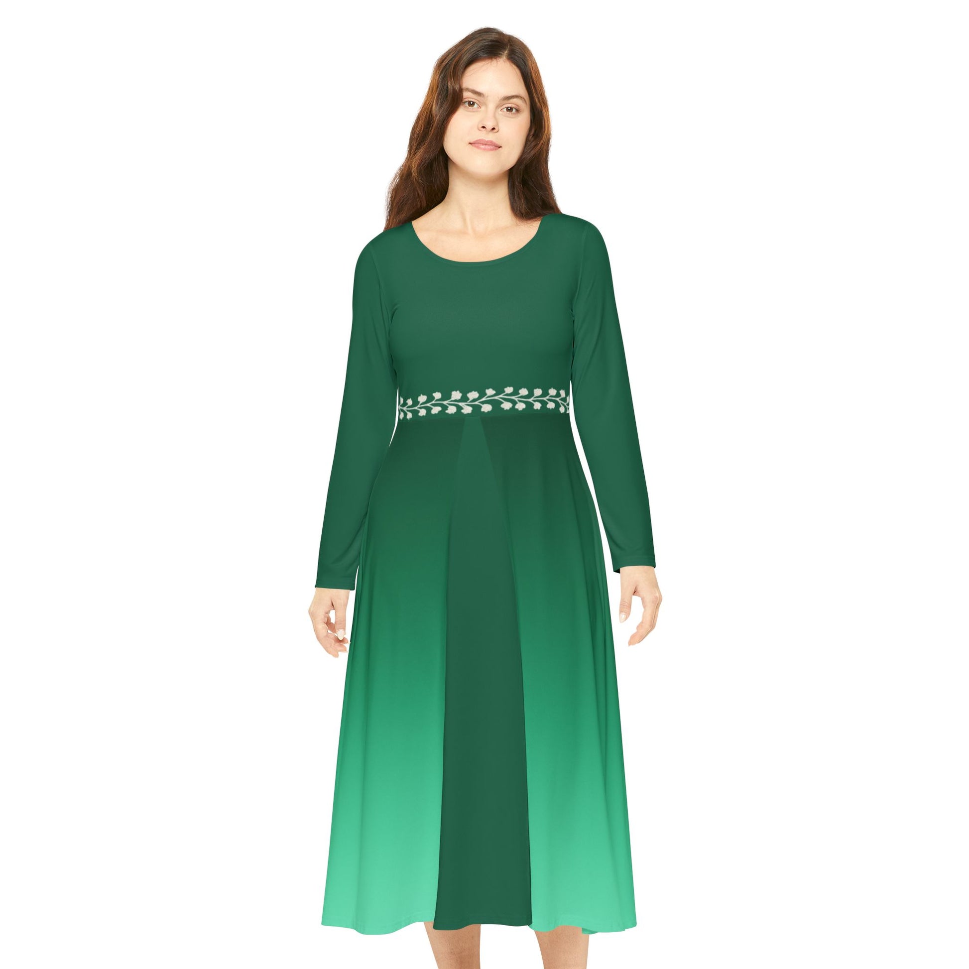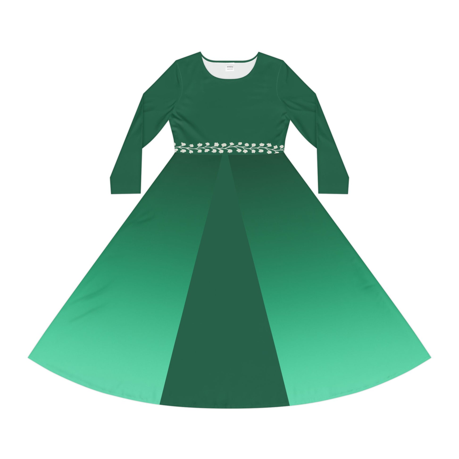 Ombre Midi Dress with White Vine Waist Emerald Long Sleeve Gradient Illusion Dress Elegant Fall Winter Dress Modest Formal or Casual Comfort