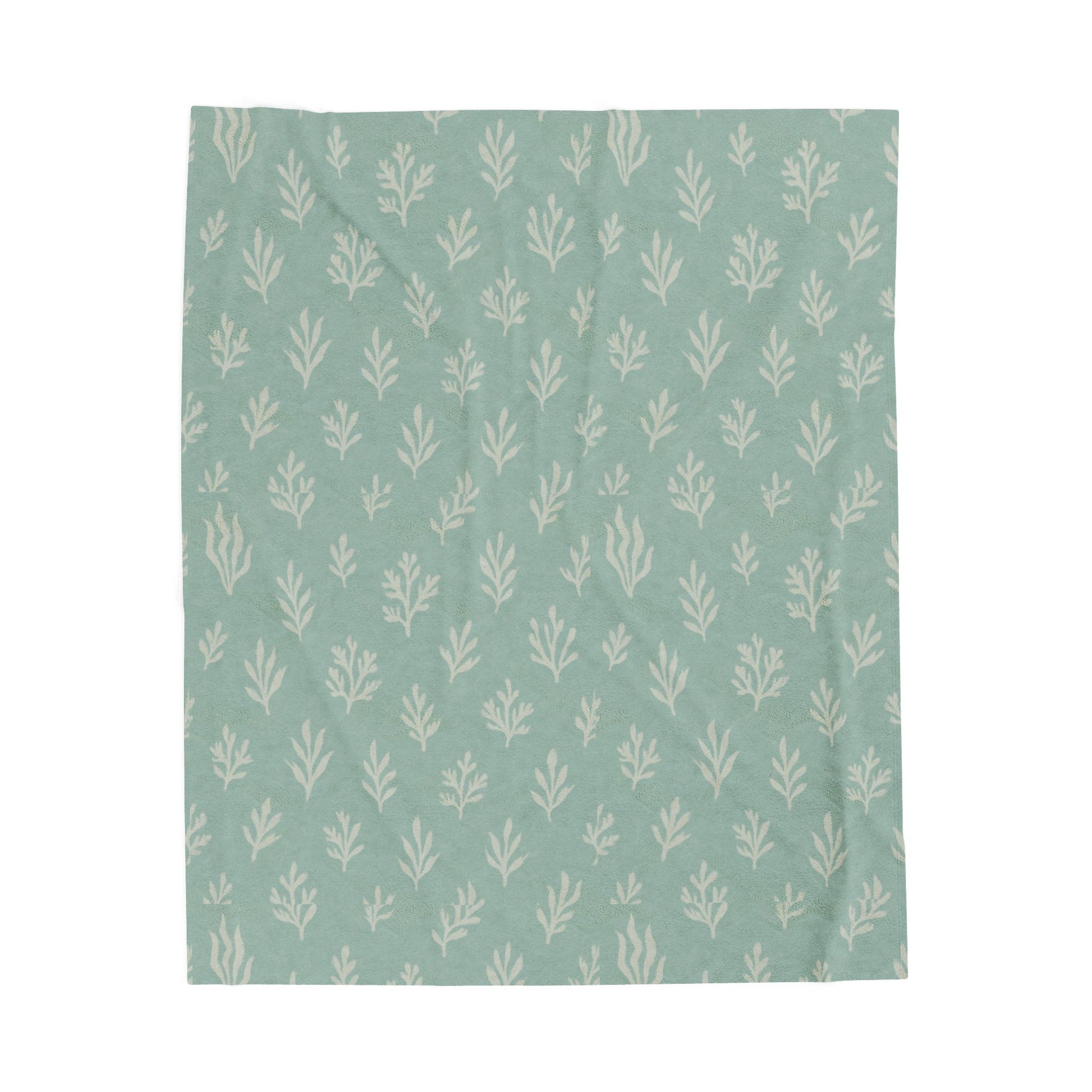 A velveteen blanket featuring a soft throw for home decor with a seafoam green seaweed pattern. Perfect for cozying up in the fall and Christmas season, ideal for housewarming gifts. This decorative blanket gives off a warm and inviting vibe, fitting seamlessly into any living space. Target audience includes adults looking for comfortable and stylish bedding.