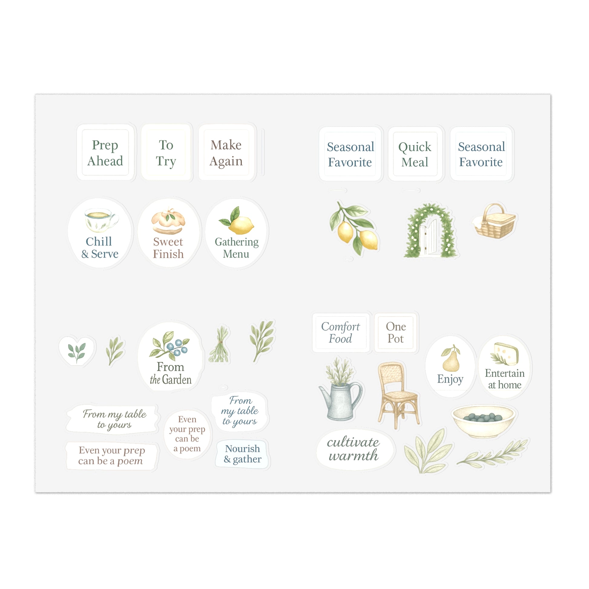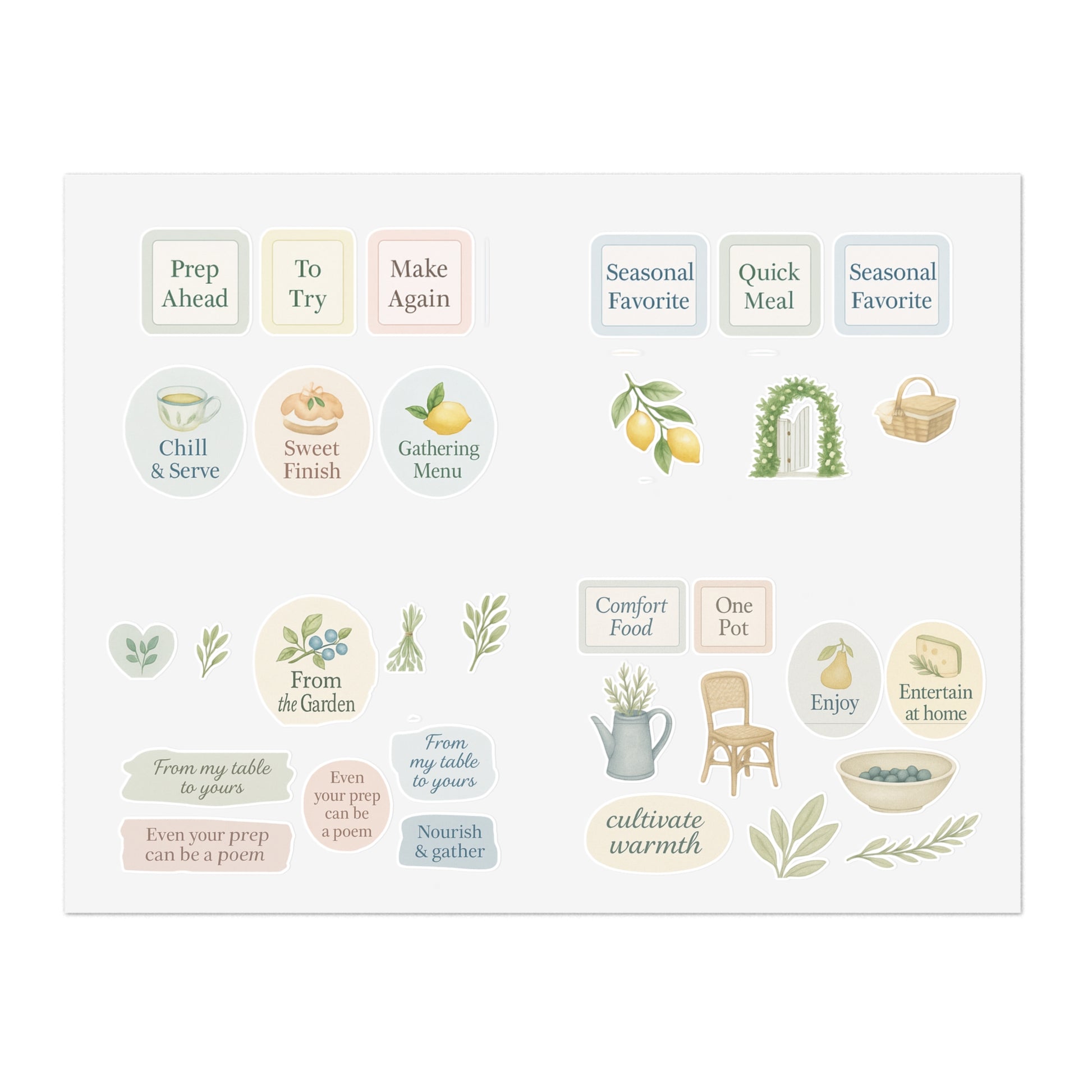Elevate your creativity with our vibrant sticker sheets, which have been designed to pair with the newly release "The Garden Table" recipe book! Perfect for adding a personal touch to the cookbook, planners, or any surface you desire. Each sheet offers a delightful variety of stickers that bring joy and inspiration to your daily life. Ideal for crafters, students, and anyone who loves to express themselves artistically. These stickers make great gifts for birthdays, holidays, or just because. Celebrate your individuality and let your personality shine with our unique designs!